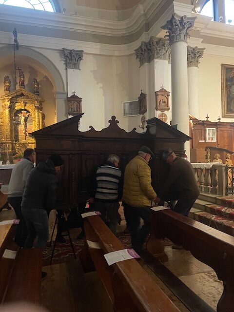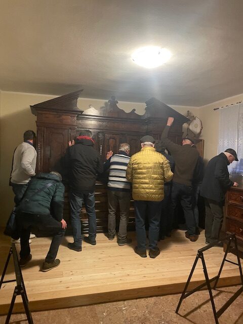 Oltre 30 i volontari che sono saliti a Cimolais per consegnare il mobile restaurato. Il restauro è durato per ben 4 corsi complessivi oltre alle ore che i volontari di Lestans hanno prestato per ultimare il tutto.