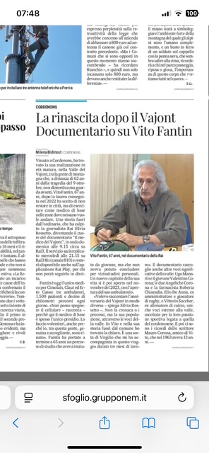 «Volevo raccontare l’anniversario del Vajont in modo diverso – spiega Silvia Rossetto –. Non la cronaca o i processi, ma la sua popolazione, attraverso le voci della valle. In Vito e nella sua storia fuori dal comune ho trovato la chiave. È una sorta di Virgilio che mi ha accompagnata in questo viaggio durato tre mesi di lavoro». Il documentario raccoglie anche altre voci significative della valle: Ugo Manarin e il giovane Valentino Corona; le due Angeliche Corona e la farmacista Roberta Chiaradia. Elio De Anna, ex amministratore e giocatore di rugby, e Vittorio Saccher, ex allenatore di calcio, uniche voci esterne alla valle, ascoltate per la loro passione sportiva legata a quella del cordenonese. E poi ci sono i ricordi dello scrittore Mauro Corona, amico di Vito, che nel 1963 aveva 13 anni. — FMV